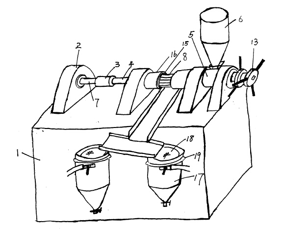 螺旋榨軸穿過料筒,并通過連軸節(jié)與減速箱動(dòng)力輸出軸相連,螺旋榨軸的錐型前端和料筒前端的錐型縮口相配合形成擠出間隙,料斗放置在料筒上,并與料筒連通,螺旋榨軸的螺牙直徑保持恒定,螺旋榨軸螺谷從后端到前端逐漸變低,出渣口處有一錐型收縮口,通過螺旋榨軸的轉(zhuǎn)動(dòng),從料斗下來的原料沿螺谷向前運(yùn)動(dòng),并逐漸受到擠壓和摩擦,在料筒的錐型收縮口,擠壓加劇,油渣分離。油從料筒的出油口段流出,出油口段上加工有可以漏油的小孔或者縫隙,油渣從料筒錐型口擠出,錐型口處料筒和螺旋榨軸的擠出間隙可以通過螺旋榨軸后端和料筒后端之間的調(diào)節(jié)螺絲/螺母進(jìn)行調(diào)節(jié),螺旋榨軸的后端設(shè)有活動(dòng)連接的螺絲,該螺絲和料筒上的固定螺母配合,螺母和料筒制成一體,料筒周邊安裝有加熱元件。加熱元件外包保溫材料,同時(shí)安裝有自動(dòng)恒溫裝置對(duì)料筒周邊的加熱元件進(jìn)行溫度控制,螺旋榨油機(jī)還帶有真空濾油儲(chǔ)油罐,這樣使榨油過程和原料加熱同時(shí)進(jìn)行,并將出油溫度控制在適宜溫度,改變了油品質(zhì)量,減少了油的加工環(huán)節(jié)。